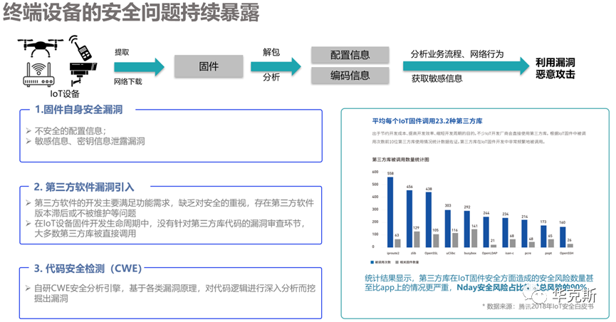 固件(Firmware)是工控和物聯網設備的核心部件,含有設備運行的操作系統、協議棧、配置文件、可執行腳本和應用組件等各類信息和程序。黑客通過(guò)獲取和逆向(xiàng)分析設備固件,能(néng)夠分析出設備的運行流程和網絡行爲,獲得口令、密鑰等敏感信息,并能(néng)夠對(duì)設備進(jìn)行漏洞利用和攻擊。用戶在工控物聯網設備入網使用前,對(duì)設備固件開(kāi)展安全檢測、發(fā)現安全漏洞并做相應防範,可顯著降低設備運行期間被攻破的可能(néng)性。