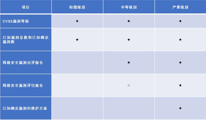 對(duì)于輕微級别,需要提供依據CVSS的漏洞等級和漏洞數,而對(duì)于中等和嚴重級别,需要提供網絡安全漏洞自評報告。